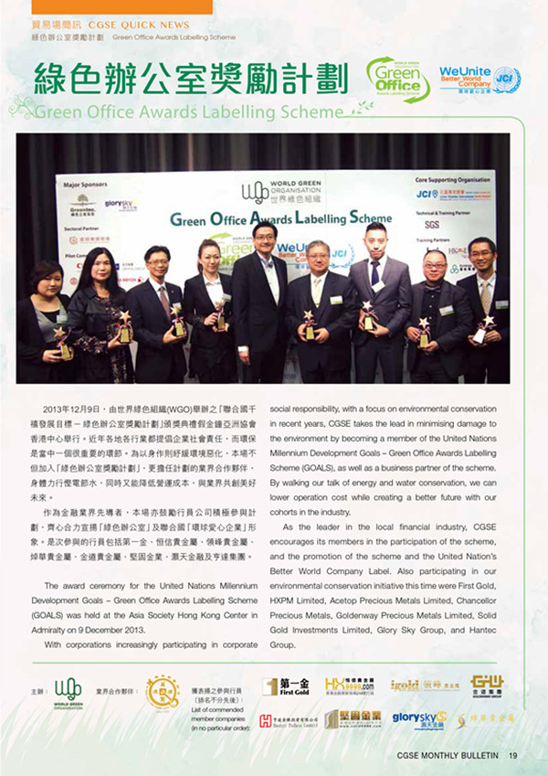 由世界绿色组织发起的第一届「绿色办公室奖励计划」(GOALS) 颁奖典礼于2013年12月9日假亚洲协会香港中心- 香港赛马会礼堂举行。这次评审中,领峰成功在9个类别、共50项绿色办公室最佳实践标准中,达到超过30项标准,并通过了严格之现场审核,最后成功获得联合国千禧发展目标的「环球爱心企业标志」及「绿色办公室奖励计划」认证奖项。