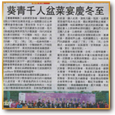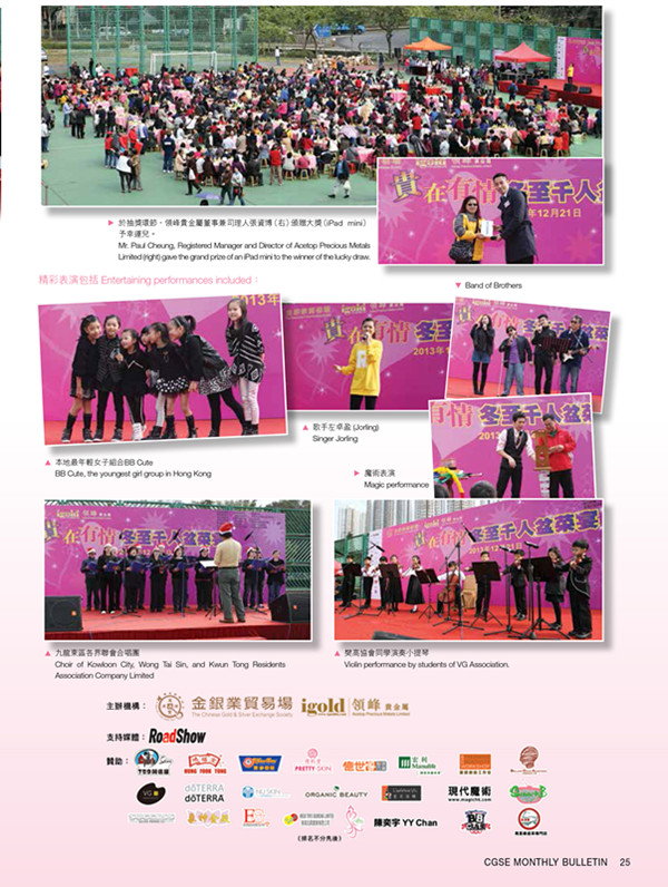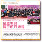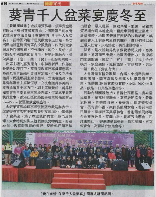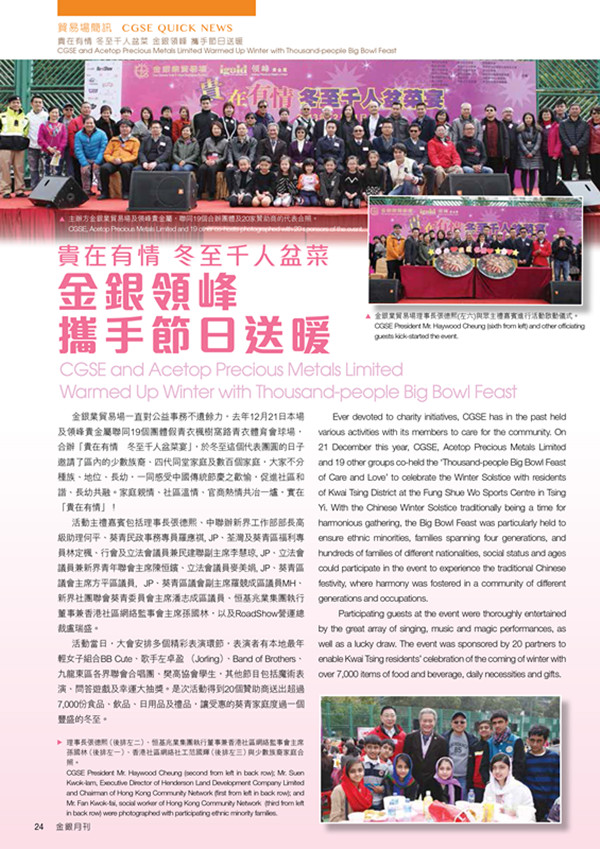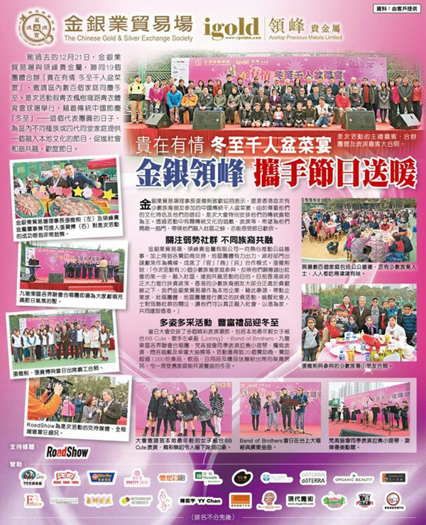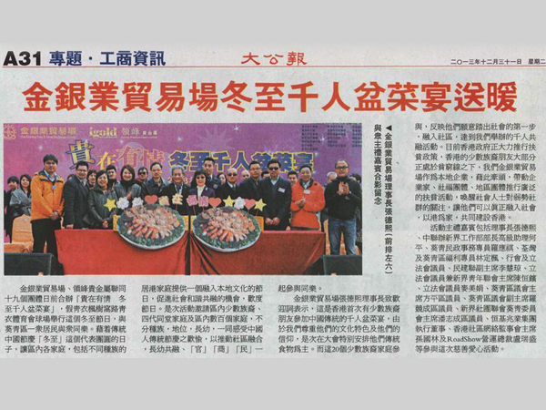 2013年12月21日, 金银业贸易场与领峰贵金属携手合办「贵在有情」冬至千人盆菜宴, 于冬至前夕假青衣体育会运动场盛大举行。这次活动邀请了超过一千位葵青区的居民参与, 包括低收入家庭, 四代同堂家庭以及少数族裔家庭, 筵开逾100席, 场面热闹壮观。为了向应这项慈善爱心活动, 领峰贵金属身体力行, 除了赞助这次活动, 向在场参与者送上爱心棉被之外, 也派出领峰慈善义工队到场支持。当日盛况得到多家媒体机构包括《香港商报》、《好报》、《大公报》, 以及RoadShow等报导。