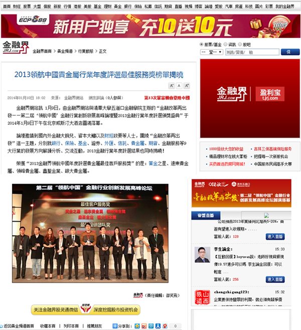 “2013领航中国金融行业年度评选”颁奖典礼于2014年1月9日假北京威斯汀大酒店盛大举行, 领峰贵金属勇夺年度“最佳客户服务奖”。“2013领航中国金融行业年度评选”活动是由全球最大的中文财经网站金融界以及清华大学五道口金融学院联合举办,包括央行、银监会、保监会、证监会、中国银行业协会、中国保险业协会、中国证券业协会、中国期货业协会、中国基金业协会等共同指导参与, 极具权威公信力。