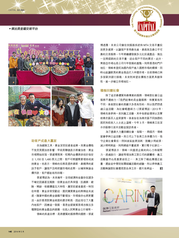 领峰连续第3年获得香港权威财经刊物《资本杂志》颁发《第十四届资本杰出企业成就奖: 杰出贵金属交易平台》。《资本杰出企业成就奖》为香港商界一年一度极具影响力及公信力的选举,本年的颁奖礼踏入第十四届,于2014年3月31日假香港海逸君绰酒店隆重举行,吸引了近百家知名企业以及多位名人政要到场参与,场面盛况空前。领峰代表更于得奖后,受邀接受资本杂志官方访问, 与广大读者分享本次获奖感受及其企业经营的成功之道。
