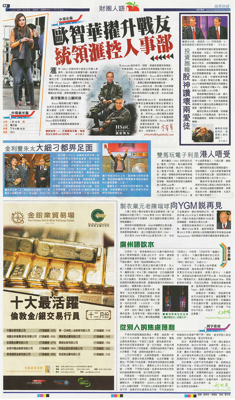 香港金银业贸易场于2015年1月15日苹果日报公布了十二月份“金银业贸易场十大活跃伦敦金/银交易行员”名单,领峰贵金属凭借彪炳的成交量名列其中,获得监管机构金银业贸易场的认可和肯定。这项排名旨在表彰十家最活跃行员对贵金属行业的贡献。