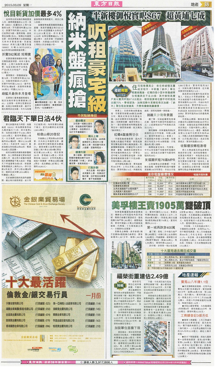 2015年3月9日,香港金银业贸易场于东方日报公布了2015新年首月份的“金银业贸易场十大最活跃伦敦金/银交易行员”名单,领峰贵金属凭借卓越的成绩再次名列其中,得到广大客户的肯定及监管机构金银业贸易场认可。这项排名为的是表彰十大最活跃行员对贵金属行业的贡献,极具实效性、真实性。