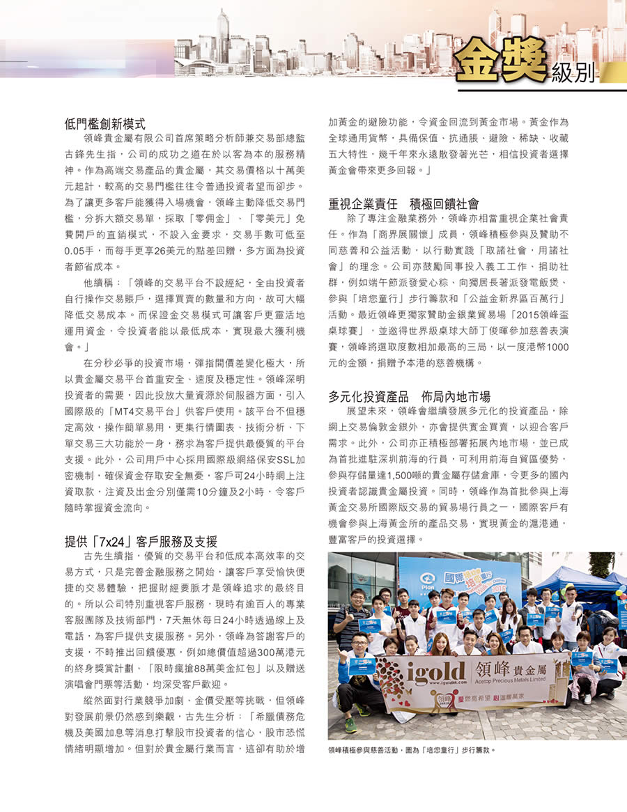 2015年7月24日,领峰贵金属荣获香港卓越企业管理学会颁发「最优秀企业大奖2015——最优秀贵金属交易平台」奖项,再度获得了业界的肯定与认可。香港权威财经月刊《资本杂志》诚邀领峰首席策略分析师兼交易部总监古锋先生进行了专题访问,深入探讨领峰贵金属如何运用创新模式,同时配合高质服务,成功将公司打造成贵金属行业的先锋企业,交流了贵金属的发展前景等热门话题。