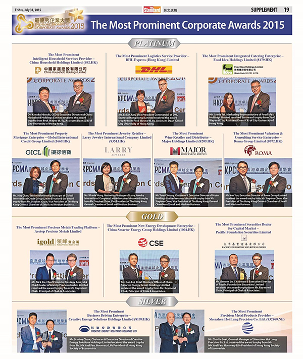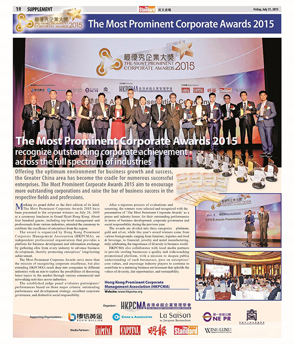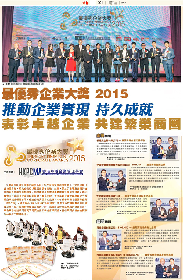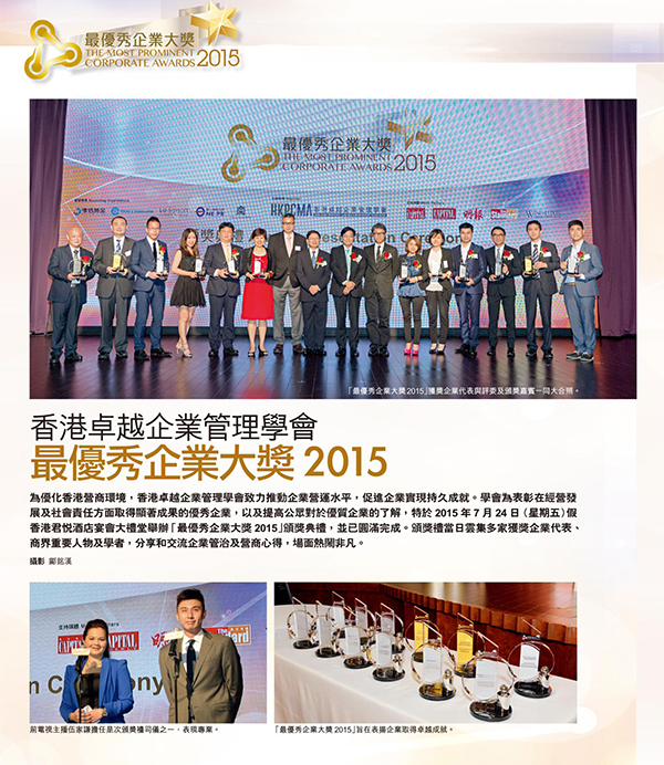 由香港卓越企业管理协会主办的「最优秀企业大奖2015」于2015年7月24日在香港湾仔君悦酒店隆重举行。领峰贵金属凭借彪炳业绩、企业管理及社会责任等多方面的综合实力一举摘夺本届「最优秀贵金属交易平台」大奖,成为本年度唯一获此殊荣的贵金属企业,彰显非凡实力。