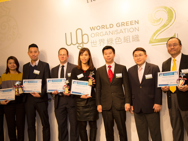 主礼嘉宾香港特别行政区机电工程署署长陈帆先生、世界绿色组织董事会主席赖锦璋 BBS, MH 太平绅士、世界绿色组织行政总裁余远骋博士, 以及领峰代表与其他得奖企业代表一同合照